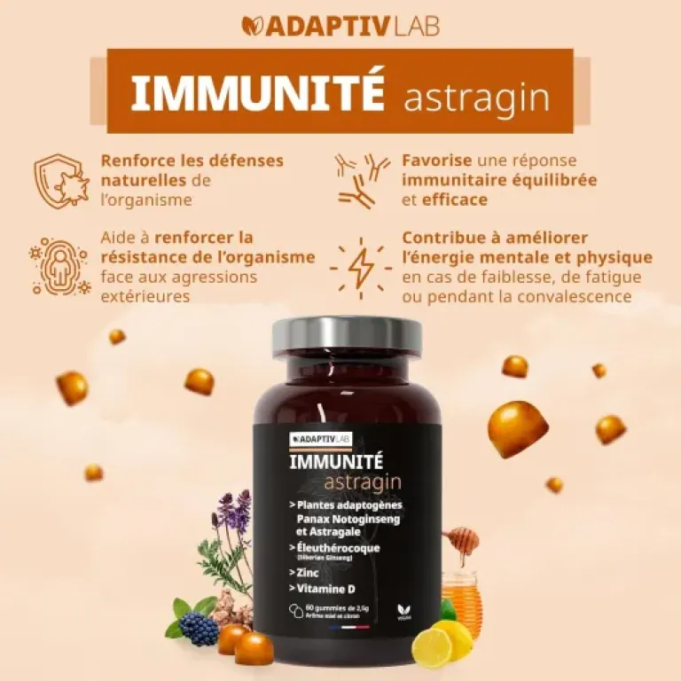 Concrètement, Astragin Immunité d’Adaptivlab, c’est un flacon de 60 gummies au goût miel/citron, censé faire un mois de cure avec 2 gummies par jour. Le positionnement est simple : renforcer les défenses naturelles et soutenir le système immunitaire, en combinant plusieurs choses : vitamine D, zinc, éleuthérocoque (une plante adaptogène) et le fameux Astragin (Panax notoginseng + astragale). Le tout est vendu comme végan, sans gluten, sans OGM et fabriqué en France, ce qui parle clairement à un certain public.